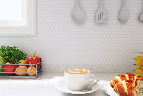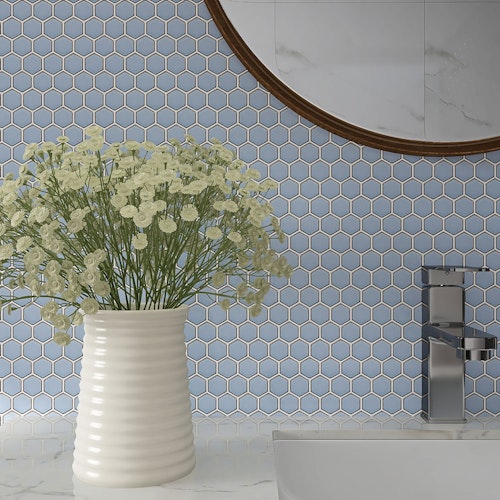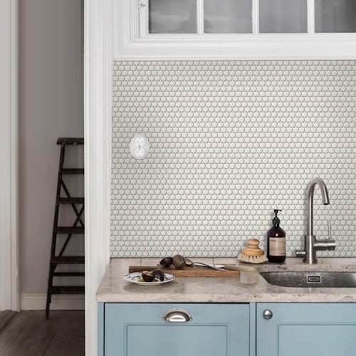 Noho Mosaics brings a modern twist to classic subway design with hexagon and penny round porcelain mosaics. Offered in a sophistiacted glossy finish, these tiles are ideal for accent walls and backsplashes.